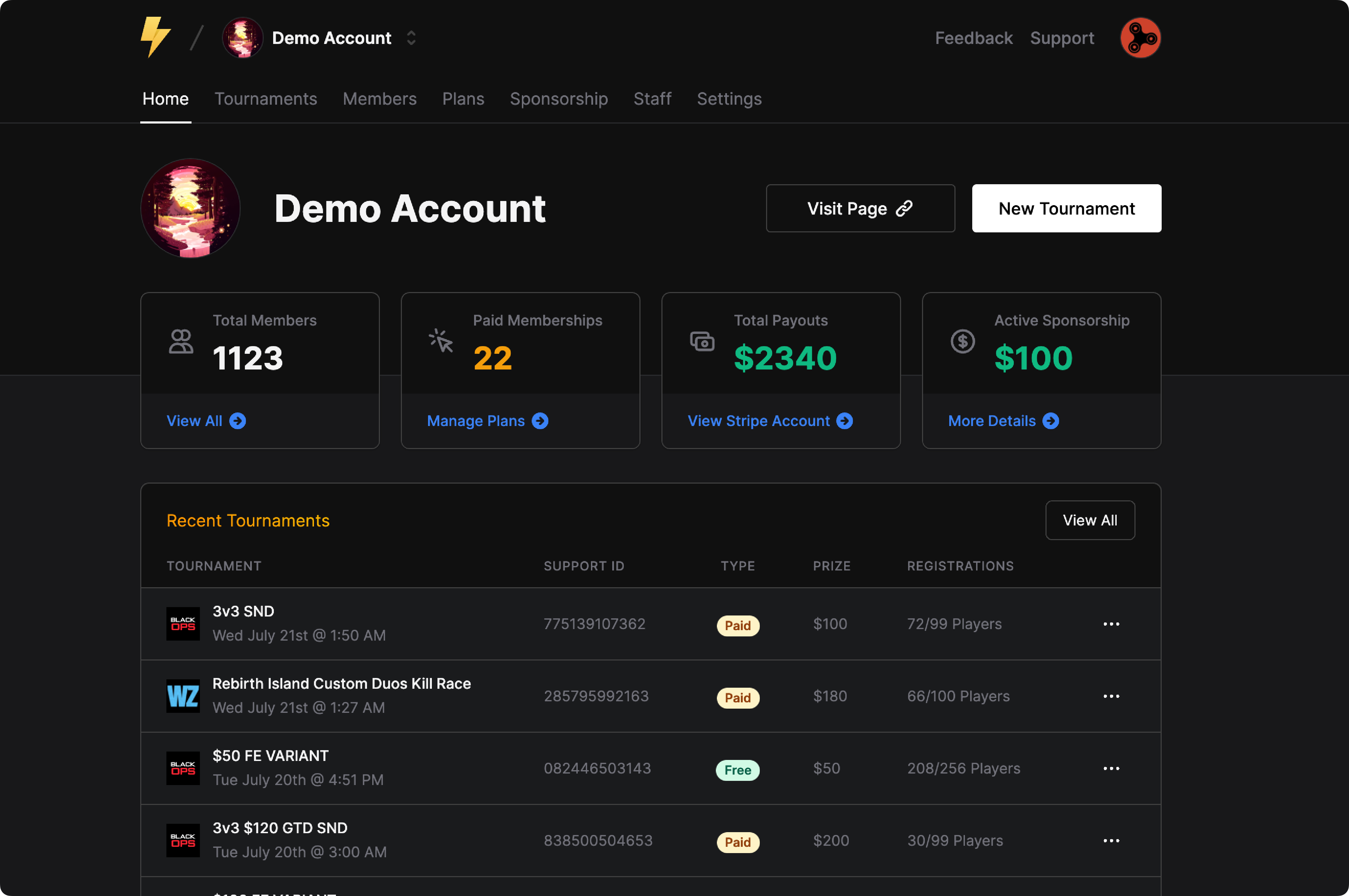 Get started for free→We make tournament hosting simple while giving you the complete control to manage your community and handle tournament disputes quickly.